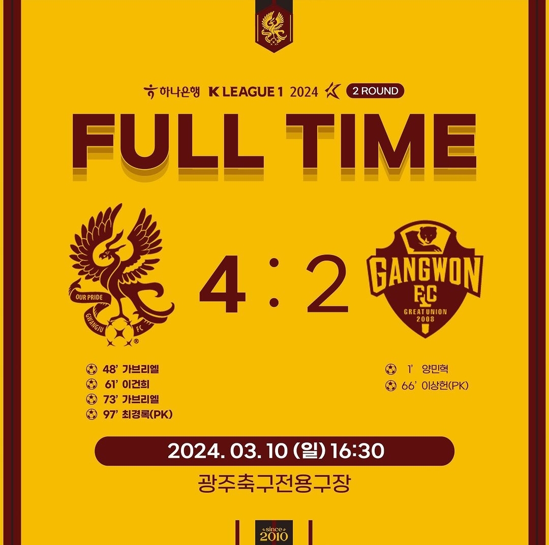 이번 라운드 가장 늦은 킥오프 휘슬이 울린 곳은 광주 축구전용구장이다. 이정효 감독의 광주와 윤정환 감독이 이끄는 강원이 맞대결을 펼쳤다. 경기 전 광주의 강우세가 예상되었다. 1라운드 광주가 보여준 고급 축구가 강원을 압도할 것으로 보였다. 그러나 판을 까보니 예상과 달리 강원이 우위를 잡았다. 전반 1분 만에 강원의 루키 양민혁이 오른발 감아차기로 광주의 골문을 출렁이게 만들었다. 예상치 못한 일격을 당한 광주 선수들이 흔들렸다. 전반 24분, 광주는 가브리엘을 투입하며 동점골을 노렸다. 그러나 강원의 거센 압박과 탄탄한 수비에 본인들의 플레이를 펼치지 못한 채 전반전이 종료됐다. 하프타임 동안 광주 라커룸에서는 이정효 감독의 불호령이 떨어졌을 것이다. 이에 정신을 차린 광주 선수들이 완전히 달라진 모습으로 후반전에 돌입했고, 후반 3분 만에 엄지성의 컷백을 가브리엘이 왼발로 마무리하며 경기를 원점으로 만들었다. 기세가 오른 광주는 강력한 전방 압박을 이어갔고, 후반 16분 이건희가 강원 수비수의 실수를 이용해 역전골을 터트렸다. 분위기가 완전 광주로 넘어갈 듯 보였다. 그러나 후반 21분 강원 이상헌이 본인의 드리블로 얻어 낸 페널티킥을 자신감 있게 차넣으며 다시 강원이 분위기를 가져왔다. 일진일퇴의 공방전이 계속되던 후반 28분, 광주의 가브리엘이 코너킥 찬스에서 헤더로 강원의 골망을 흔들었다. 가브리엘은 첫 골 때 생략했던 어흥 세레머니를 선보이며 기쁨을 표출했다. 다시 광주가 리드를 잡은 양 팀 선수들이 달아올랐다. 광주는 계속 라인을 올려 공격했고, 강원도 물러서지 않았다. 현재 스코어로 경기가 끝나지 않을 거 같았고, 예상은 맞아떨어졌다. 계속 몰아치던 광주가 후반 추가시간 페널티킥을 획득했고, 최경록이 침착하게 마무리했다. 홈팀 광주의 4-2 승리로 치열했던 경기가 끝났다