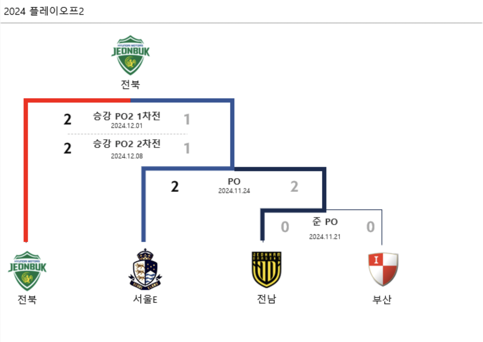 전북과 대구가 기적적으로 살아남았다. 전북은 서울 이랜드를 대구는 충남아산을 만났다. 대구는 1차전을 3-4로 패하면서 강등의 공포가 코앞까지 찾아왔다. 그러나 1차전 1-4로 뒤쳐진 상황에서 경기 막판 세징야가 연속 득점을 성공해놓은 덕분에 2차전에 희망을 가질 수 있었다. 2차전에서 대구는 후반 90분까지 2-0으로 앞섰으나 추가시간 실점을 허용하면서 합계 스코어 5대5로 연장전에 돌입했다. 연장전에서 이찬동이 벼락 같은 슈팅으로 득점에 성공하면서 대구가 극적으로 잔류를 확정지었다. 이어 열린 전북은 1차전 원정에서 전진우의 역전골로 2-1 승리를 거둔 채 2차전을 홈에서 치뤘다. 그러나 서울 이랜드에게 선제골을 허용하면서 전반전을 마쳤다. 다급해진 전북이 공격적으로 나섰고, 티아고와 문선민의 득점에 힘입어 잔류에 성공했다. 전주성은 우승했을 때 처럼 오오렐레가 울려퍼졌다. 승강 플레이오프에서는 K리그1 팀이 선수단의 체급차이로 압살하는 모습을 보였다.