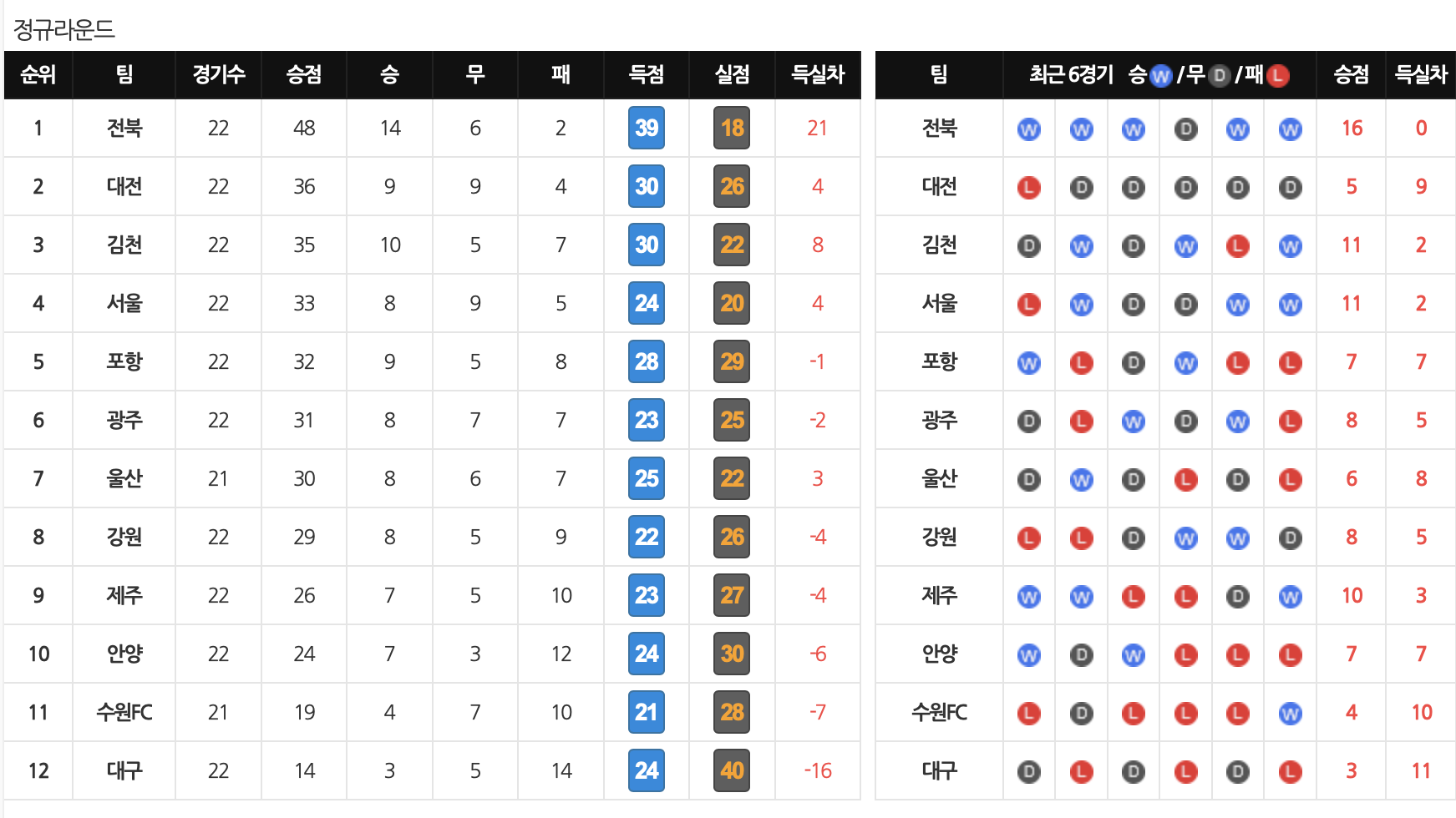 2025 K리그 2로빈 종료 후 순위표