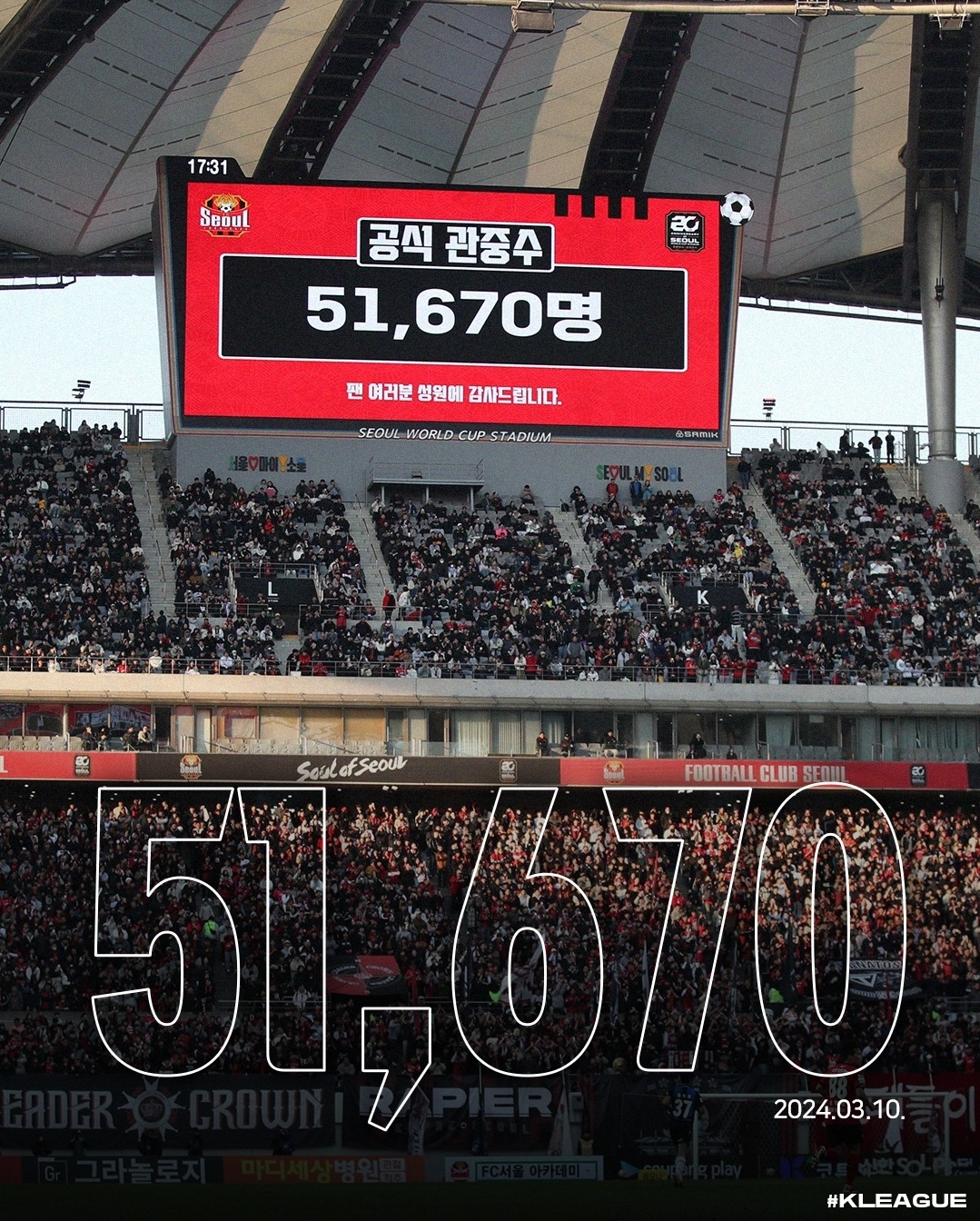 51,670명. 하나은행 2024 K리그가 2라운드도 흥행 돌풍을 이어갔다. 돌풍의 선두에는 FC서울이 있었다. 홈 개막전에 51,670명의 구름 관중을 동원했다. 서울 외에도 포항에서도 1만명을 넘었고, 제주와 수원도 1만명에 가까운 많은 관중이 k리그를 찾아왔다. 2라운드 총 관객수 92,890명으로 1라운드에 육박했다. 여섯 경기에서 총 21골이 터진 가운데, 시즌 초반이지만 벌써 예열을 끝낸 팀들도 보였다. 봄이 성큼 다가온 가운데 펼쳐진 2라운드를 다시 살펴보자.