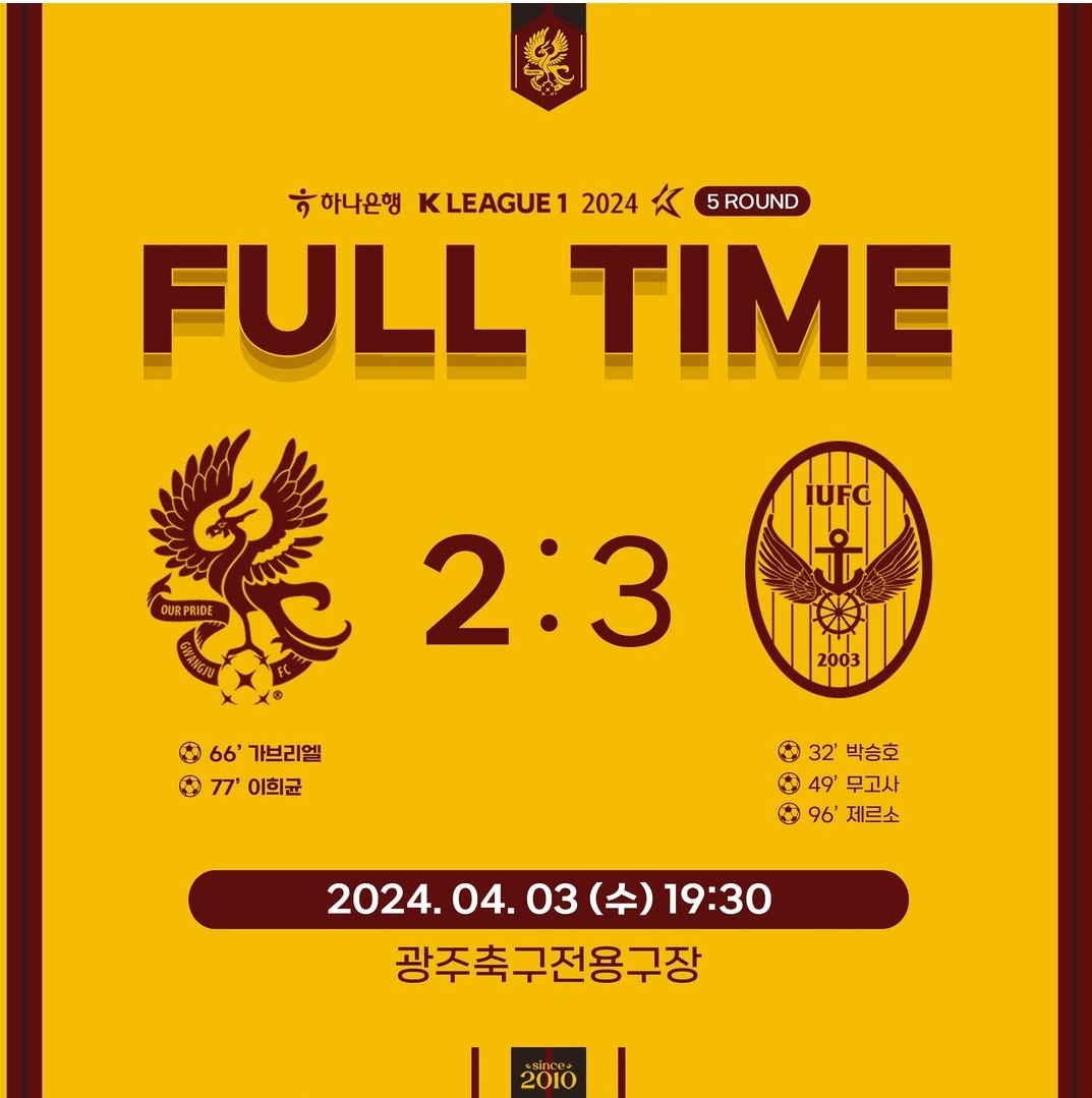 3. 광주FC vs 인천 유나이티드 (4/3, 19시30분, 광주 축구 전용)